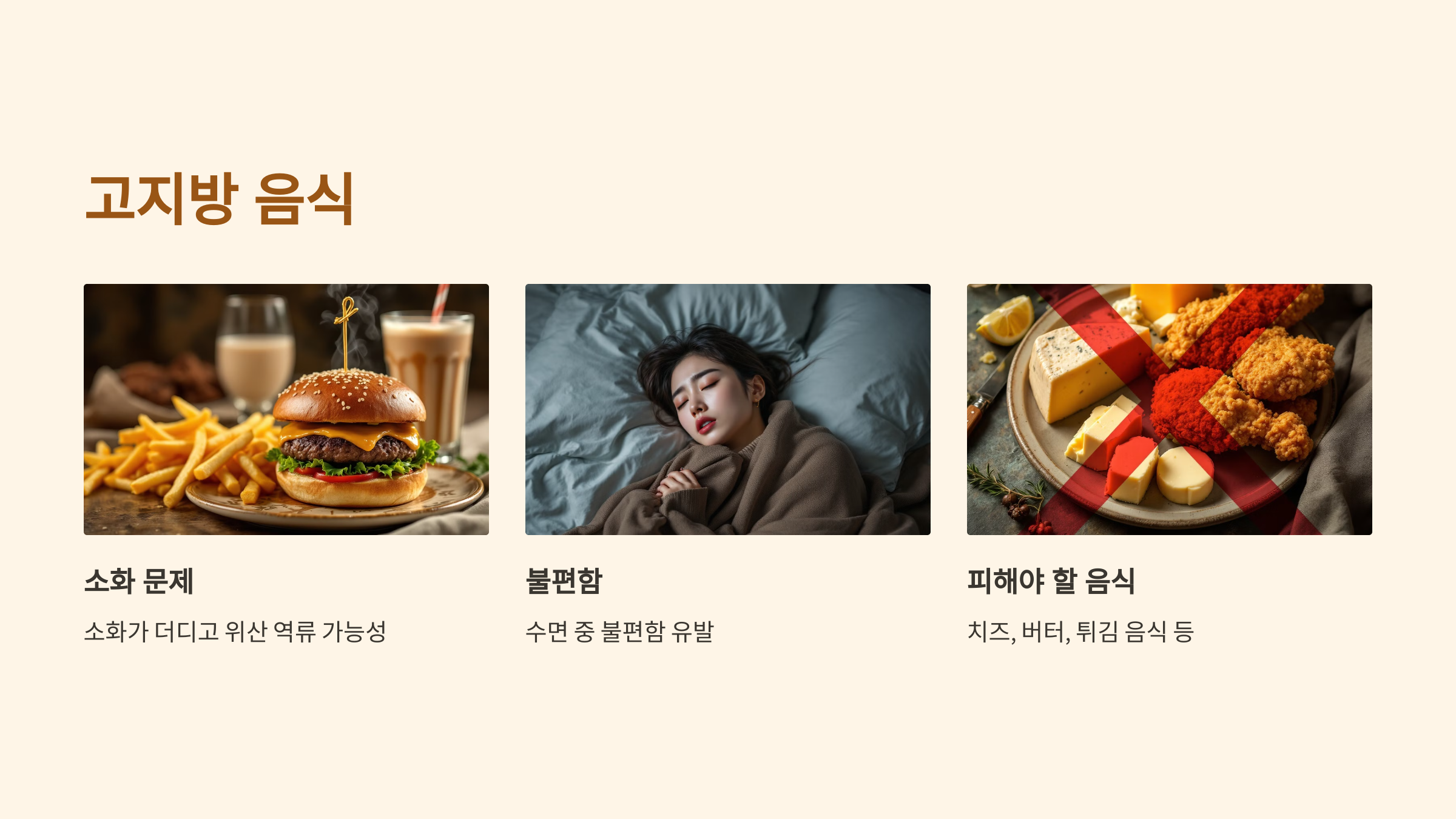 고지방 음식은 소화가 더디고 위산 역류를 일으킬 가능성이 높아 잠자리에 들기 전에는 피하는 것이 좋습니다. 치즈, 버터, 튀김 음식 등 고지방 식품은 소화에 부담을 주고, 수면 중 불편함을 유발할 수 있습니다.