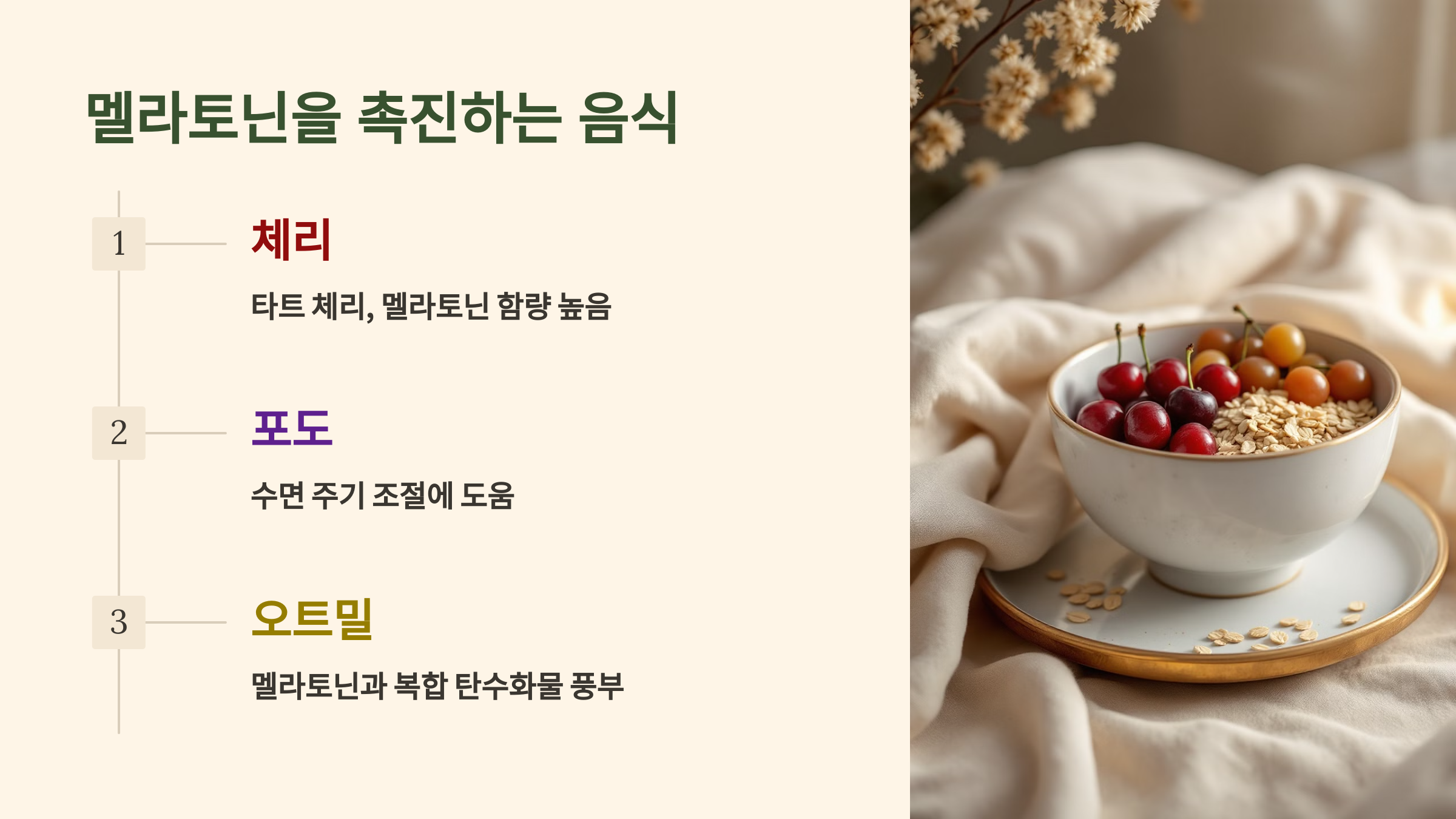 - 체리: 특히 타트 체리는 멜라토닌 함량이 높아 저녁에 섭취하기 좋습니다.