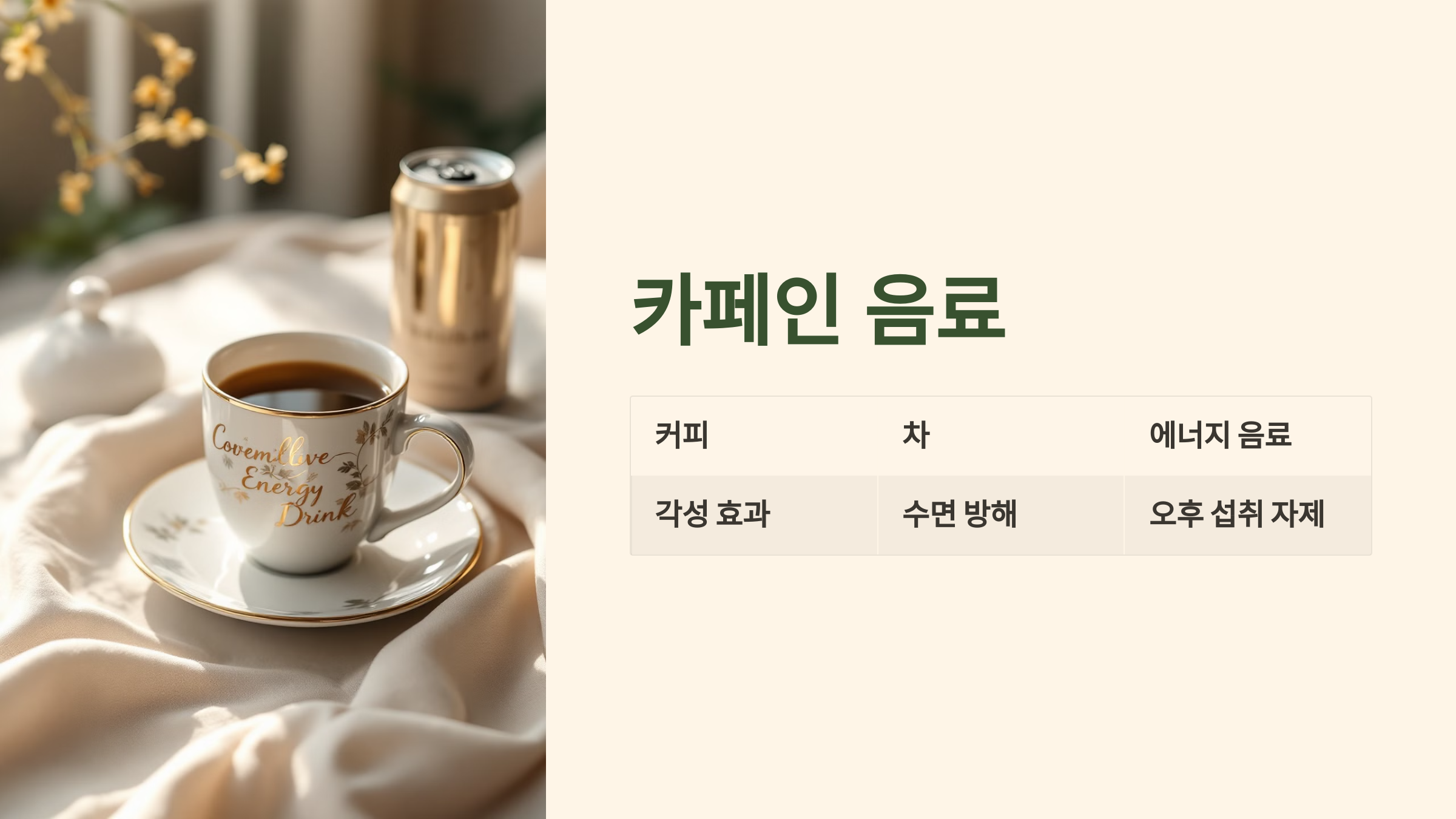 카페인은 뇌를 각성시켜 잠을 방해하는 대표적인 성분입니다. 커피, 차, 에너지 음료는 카페인이 많아 수면에 부정적인 영향을 미칠 수 있습니다. 카페인의 각성 효과는 섭취 후 몇 시간 동안 지속되므로, 오후 늦게나 저녁 시간대에는 카페인 섭취를 피하는 것이 좋습니다.